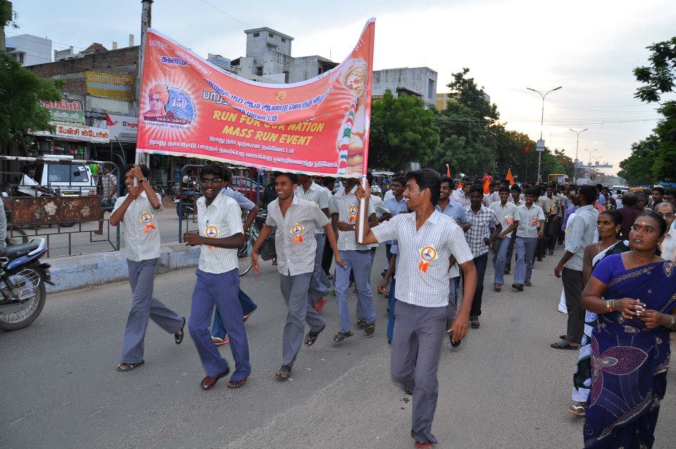 Commemorating Swami Vivekananda 150th year Birth celebrations ‘Run for the Nation – Mass Run event was organized in all district head quarters of all over the country. In Chennai, the event was inaugurated by Serial/Cine fame Kutti Padmini. Sri Gautamananda, President of Sri Ramakrishna Mutt Chennai blessed the event, Mayor Saidai Duraiswamy, Chennai Corporation presided over the event. VHP State leader R B V S Manian highlighted on the importance of Swami ji’s speech at Chicago. Among 7500 people there, 5200 participated in the Run.