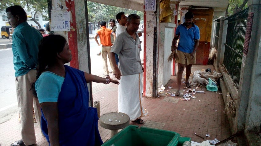 cleaning the Bus stop area, Valluvar Kottam as a part of Seva Sanghik activity.