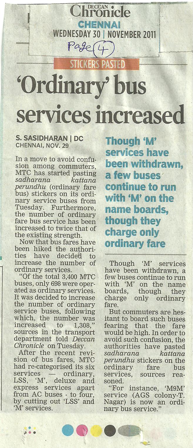 City Bus users of Chennai heaved a sigh of relief following a remarkable effort of Akhila Bharatheeya Grahak Panchayat, Chennai, (A movement for Consumer awareness). Here is the detail: