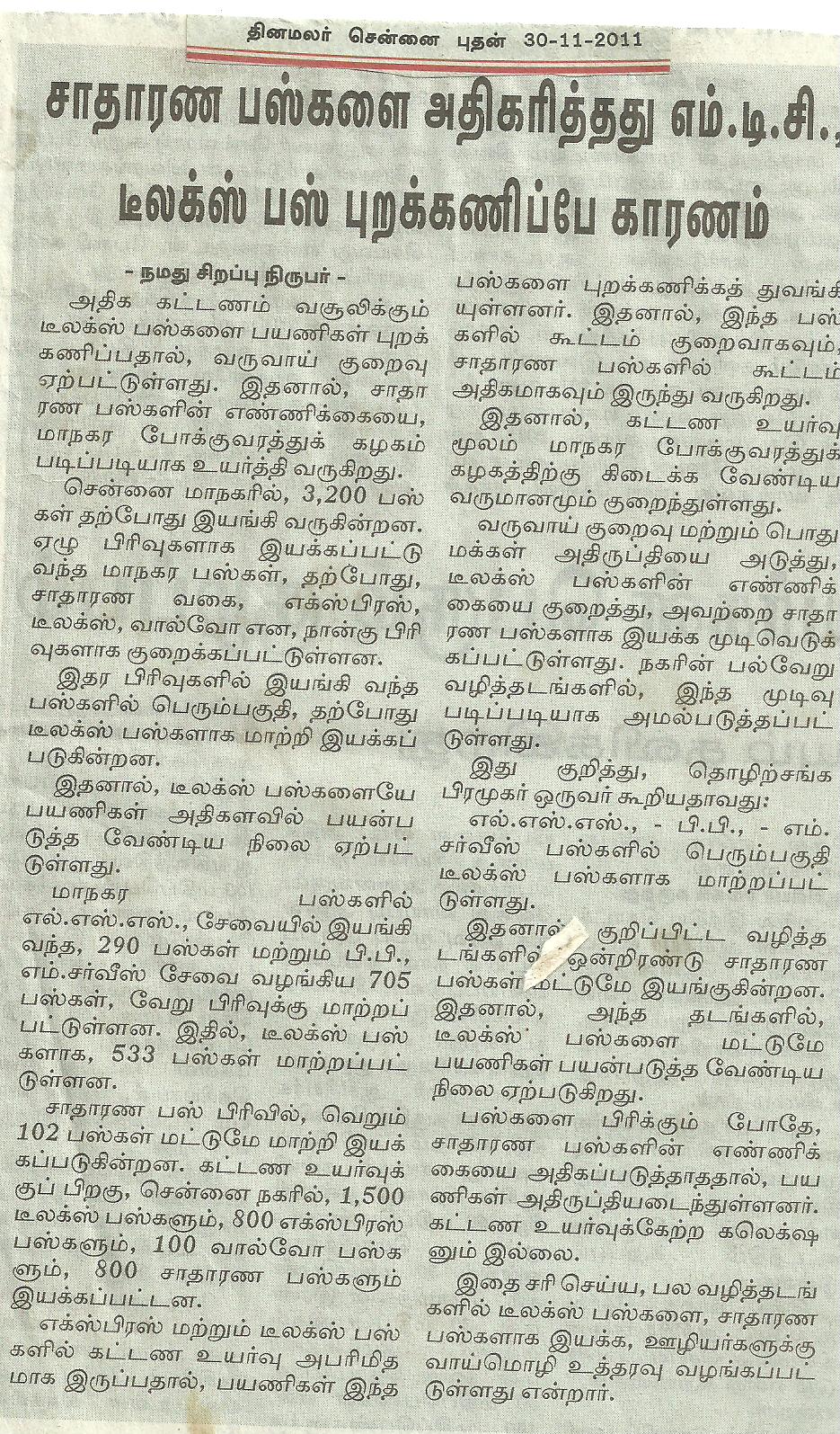 Only 698 buses were plying as ‘Ordinary’ buses charging lower rates. This was increased to 1308 buses following representation by ABGP to the transport minister. The 6-tier ticket rates has been reduced to 4-tier. This also goes to the credit of ABGP. This is the latest achievement of ABGP educating lakhs of poor bus travelers. It is remarkable that ABGP secured signatures of 5,000 city bus travelers of Chennai in its Memorandum to the Transport Minister.