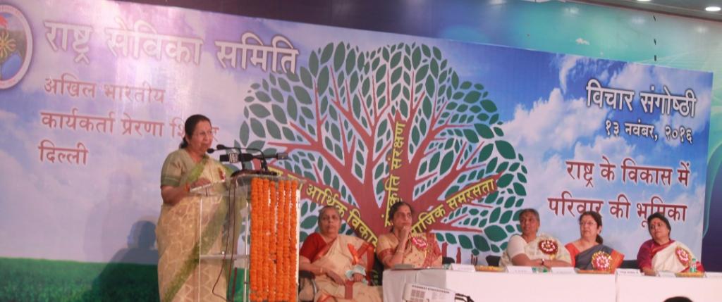 “It is imperative today to take the youth towards a positive and inclusive direction, to confront a well-planned conspiracy that is being worked out by provoking the youth of Kashmir Valley as well as the youth of the rest of India along the lines of communal and caste divisions. The Rashtra Sevika Samiti through it varied social programmes has taken on the challenge to empower and enlightened the youth and leading them towards a constructive path”. Expressing concern over the growing discord in society in her address at the closing session in Delhi today of the three-day Rashtra Sevika Samiti’s Prerna Shivir, the all India Sanchalika (President) Shanta Akka said it is a must to take a pledge to steer the youth away from a materialistic lifestyle and narcotic- products consumption, “We need to inculcate hope, a purposeful goal and positive values”.