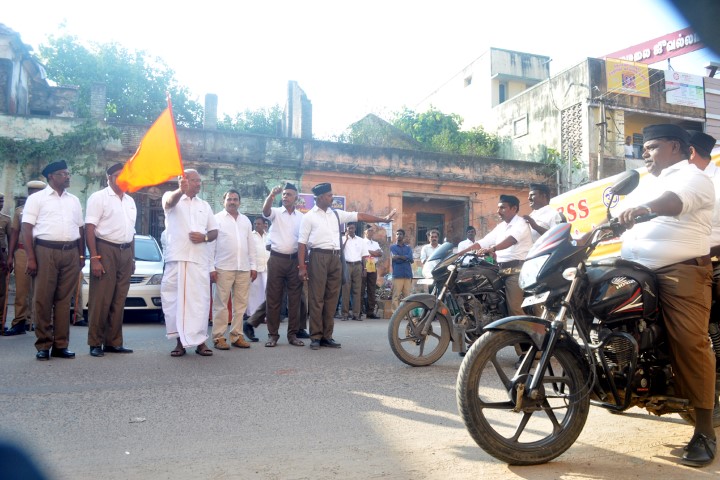 In Chennai, Route March for 3 km began at Natesan Vidyasala, Mannivakkam. Shri Muthukumar, President of Washermen (laundry) Sangh flagged off. Shri Kathiresan, Vazhga Valamudan presided over the event. RSS State Outreach Wing Secretary Shri B Prakash addressed the gathering. Narrating on the developments of Sangh in Tamilnadu, he hit out at the critics of ‘land of Periyar’ and said that Tamilnadu is always the spiritual land and contributed to the nation ever. He further appealed to devote time and contribute to the society for good.