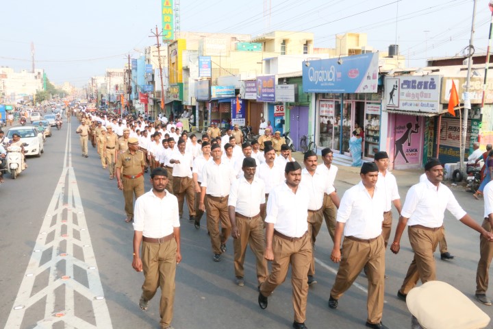 In Chennai, Route March for 3 km began at Natesan Vidyasala, Mannivakkam. Shri Muthukumar, President of Washermen (laundry) Sangh flagged off. Shri Kathiresan, Vazhga Valamudan presided over the event. RSS State Outreach Wing Secretary Shri B Prakash addressed the gathering. Narrating on the developments of Sangh in Tamilnadu, he hit out at the critics of ‘land of Periyar’ and said that Tamilnadu is always the spiritual land and contributed to the nation ever. He further appealed to devote time and contribute to the society for good.