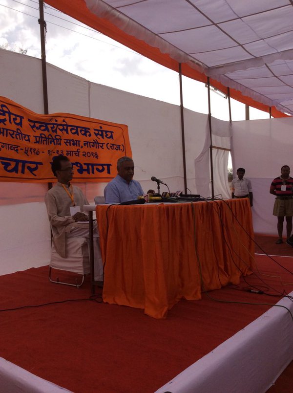 RSS three day Akhil Bharatiya Pratinidhi Sabha meet will commence from March 11 to March 13, 2016 at Nagaur Rajasthan. Dr. Manmohan Vaidya, Akhila Bharatiya Prachar Pramuk (Media Relations) addressed the curtain raiser press meet today. He informed the media that RSS will three resolutions on (1) Affordable health service for all (2) Accessibility quality education to all and being 125th Birth Anniversary of Dr. B R Ambedkar and 100th Birth Anniversary of third Sanghachalak Balasaheb Deoras Ji third resolution will be on social harmony.