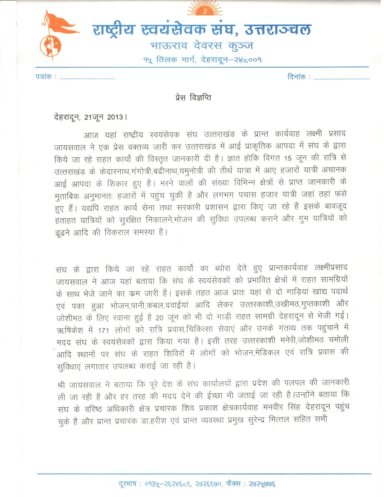 * Enquiries are pouring in from Sangh Karyalayas across Bharat wishing to know what all could be sent to Dehradun to be useful in the relief work of Swayamsevaks.