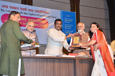 The senior journalist award comprises of Rs. 15 thousand in cash, memento, Kshawl and coconut while other awards comprise of Rs. 7.5 thousand in cash, memento, shawl and coconut. Shri. Manohar` Kulkarni, President of Vishwa Samwad Kendra, Dr. Ajit Patwardhan, President of the Council and Governing Council of the Deccan Education Society, Ravindrasinh Pardeshi, principal of the Fergusson College were present on the dais. The audience comprised of many dignitaries and journalists among others. Speaking on the occasion, Shri. Ram Madhav said, “The journalist should consider every awards as an additional responsibility. The scientists make a nuclear bomb in 20 years, but a journalists prepares a nuclear bomb every day. The journalism was a mission during the independence struggle of India. At that time, every big leader used the journalism as a means. However, today journalism has become an industry. There is an urgent need to bring back the missionary zeal of that era.” Speaking of the new turns that the journalism has taken, he said that today the journalism has passed the phase of professionalism and become agitative journalism. “The journalism is plagued with tendency of defiance. Today’s society is well informed. Hence, the people today want the humility. The responsibility of the social media is much more than the mainstream media. The freedom of expression is important but the freedom of life is absolute. Today the democratization of the media has taken place in truly and this is good for the country”. He warned that it would be better if media contributed to the development of the country, but people wouldn’t tolerate if they opposed it. He also touched upon the diminishing sensitivity of the society and said, “No single person should die in the country. We should explore the answers to the questions like what is the status of women in today’s society, whether a woman can become a successful politician and what is the plight of the dalits.” The Devarshi Narad Senior Journalist Award was given to Dilip Dharurkar. Replying to the award, he said, “This is an award given to my devotion of a lifetime. When I started my career, there was intellectual terrorism in media. To put forward the thoughts of Rashtriya Swayamsevak Sangh was impossible. It is still prevalent today and can be felt everywhere. The media has to turn to national renaissance now.” The Young Journalist Award was given to Mustafa Attar. Replying to the award, he said, “This is a felicitation done by the Puneites which is why I am very delighted with this award. I always strove to take care of the health of the Puneites during my career of 13 years and I am proud of it. The satisfaction seen of the faces of the people is the inspiration behind my work. I will continue to do this work.” Shefali Vaidya, who received the first ever Social Media Award, said, “I started writing on internet in 2013. At that time, I had no idea that my writing would become so popular. Today my writing reaches to almost 8 lakhs people. This has given me many accolades and awards. I dedicated this award to my family and my readers. The mainstream media is trying to sell falsity in the name of popularity. I started writing against it as a reply from a true citizen.” In his inaugural address, Shri. Kulkarni said, “Now is the age of new media. That is why we started giving social media awards from this year. The main work of the Vishwa Samwad Kendra is interacting with the media. Enlightenment, publication and training are the three pillars of the Vishwa Samwad Kendra’s work.” Dr. Ajit Patwardhan said, “Three of the five founders of the Deccan Education Society were noted journalists. Hence, the society was associated with the journalism from the start. Youngsters are influenced most by the media after schools and colleges.” Deepa Bhandare was the compeere of the program while Ravindrasinh Pardeshi gave the vote of thanks. Box People of Kashmir are ours Refering to Kashmir, Shri. Ram Madhav said that we have to accept not only the land but the people also of the Kashmir. Kashmir is an integral part of the India and there can be no discussion on it. The people there have every right to press for their demands but it should be done in the framework of the Constitution. Some people there pro-Pakistan in Kashmir but their number is very low. We have to win over the hearts of the Kashmiri people to strengthen the nationalist forces there. ——–
