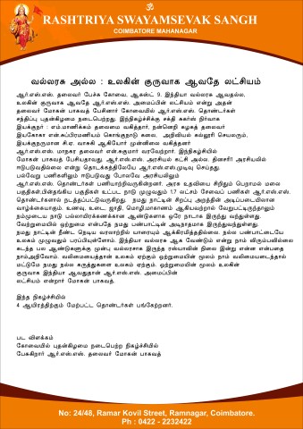 Sakthi Sugars Chairman M Manickam presided over the program. Iyakoka M Subramaniam, and Secretary Kongunadu Arts and Science C A Vasuki participated in the program. RSS District President N Sukumar welcomed the gathering.