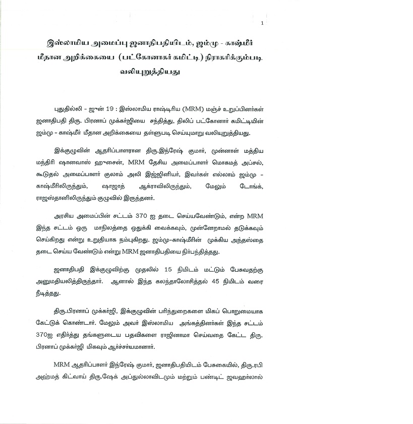Muslim Rashtriya Manch (MRM) urges the President of India to reject Interlocutors' Report