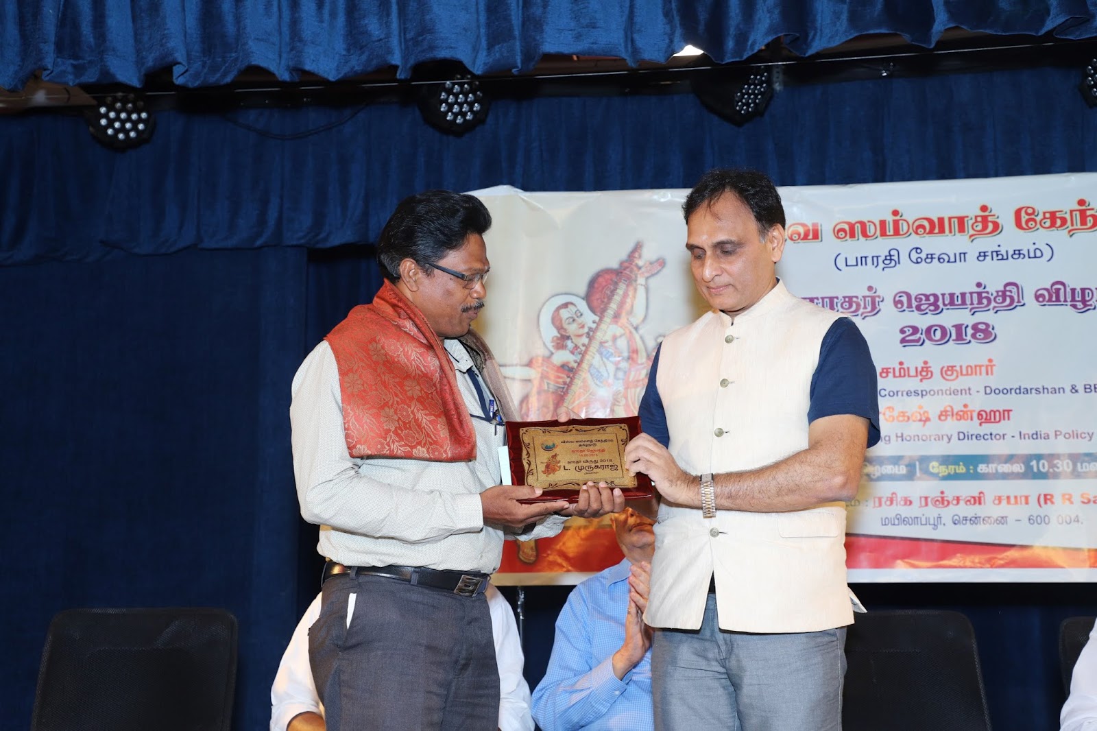 Narad Jayanthi and felicitation awards to journalists for this year was organized by Vishwa Samvad Kendra at Rasika Ranjani Sabha, Mylapore on 16th June. The program started with a prayer song by Shri Ranganathan, Giri Trading. Following the welcome address, five journalists were felicitated. Entries were called for from the media houses and a team of jury selected the awardees this year with some entries. Shri M R Ramalingam, Dinamalar, Smt Manjula Ramesh, Snegithi, Shri Vasanthan Perumal, Thuglak, Shri Rajagopal R, All India Radio and Shri L Murugaraj, Dinamalar were the journalists felicitated ‘Narad Jayanthi’ awards. Shri Rakesh Sinha, Founding Honorary Director of India Foundation Policy, Delhi addressed the gathering. Shri Sampath Kumar, Former Correspondent – Doordarshan and BBC presided over the function.