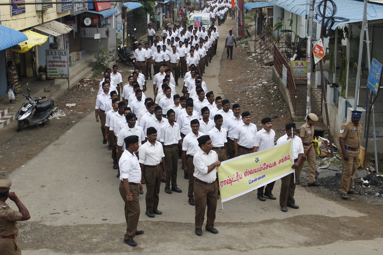 RSS held two route marches in Chennai on Sunday , October 21, to celebrate the 94th foundation day. The south chennai event was held at The Shankara Matriculation school in Urapakam. 1058 volunteers of RSS marched to rhythmic band along the GST road. Shri S Perumal , a leading entrepreneur presided. He also released a book on the RSS based on the recent 3 day lecture by RSS chief.