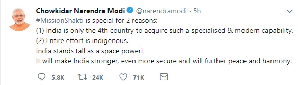 On the significant occasion of India’s becoming a space super power after the successful Mission Shakti : testing of Anti-Satellite weapon A-SAT, we salute and compliment our scientists as well as the central leadership on behalf of the people of India.
