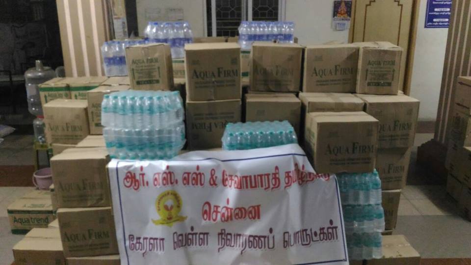 RSS-Sevabharathi volunteers are mobilizing tones of relief materials, essential items through its network of volunteers and other like-minded organizations for the monsoon victims in Kerala. RSS-Sevabharathi volunteers continuously engaged themselves in loading, unloading, disseminating relief materials from Chennai Karyalaya at Purasaiwalkam. So far 8 truck relief materials were dispatched with