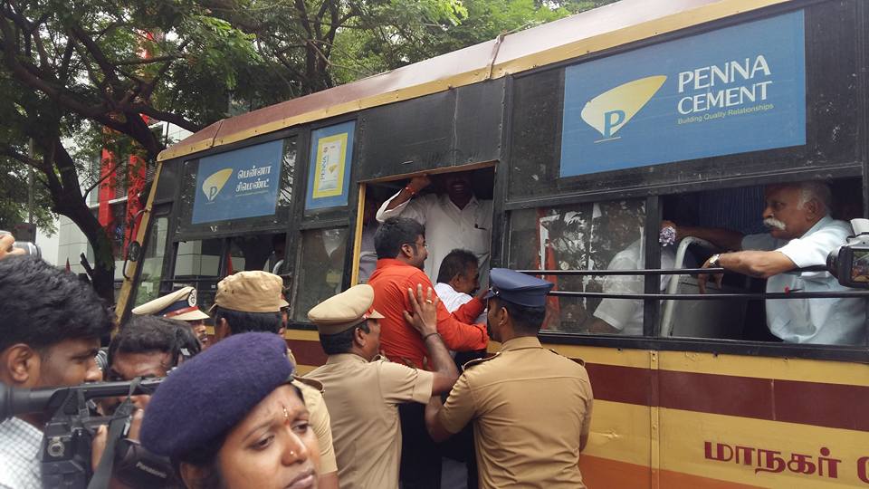 police kept changing the place of venue several times till night. Around 1200 men, women, transgenders took part in the protest demo. RSS State Secretary (Uttar Tamilnadu) Shri Sambamurthy, Vividha Kshetra leaders to name few-Hindu Munnani Organiser Shri Bakthavatsalam, Sevabharati Pramuk Shri Ramarajasekar, Sevabharati Sankatan Mantri Shri Srinivasan, BJP State President Thamizisai Soundararajan, BJP National Member H Raja, Shri Veerabahu-Editor, Vijayabharatham, were arrested. Leaders strongly condemn the undemocratic attitude and behaviour of the State Government.